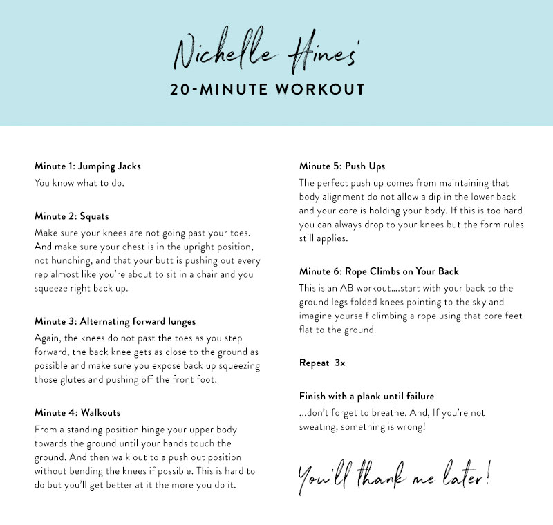 When I don’t have a lot of time or equipment, I love hitting large muscle groups, while keeping the heart rate high. Make sure you’re doing as many reps as you can in that minute with excellent form. (Check out Nichelle’s 20-minute workout below)