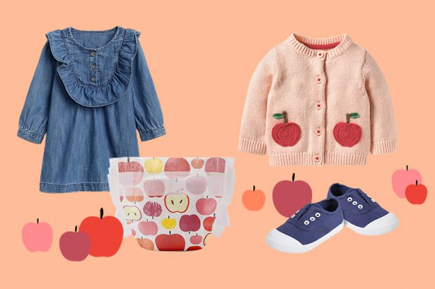Denim Ruffle Dress | Apple Crochet Cardigan | Slip-on Canvas Sneakers | Them Apples Diaper