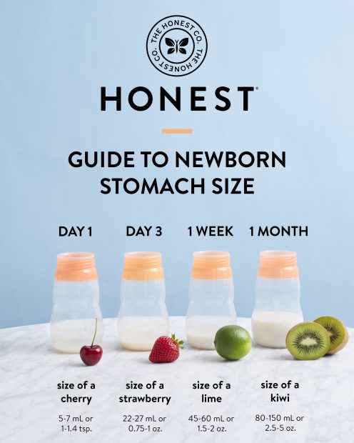 A baby needs to breastfeed frequently, including nighttime. Check out our guide to your baby’s developing stomach sizes and feeding measurements below: